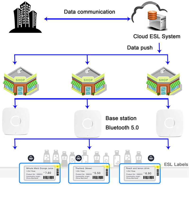 מערכת תווית מדף אלקטרונית מורכבת מתקנים, שרתים, מתגים, תחנות בסיס, שפופרת ותוכנה. פרטי המוצר במסד הנתונים יועתקו ממערכת הקופה לתוכנת היישום של מערכת תווית המדף האלקטרונית; לאחר מכן ישלחו מחירים מעודכנים או מידע אחר באמצעות WAN לתחנות הבסיס אשר לאחר מכן יפרסו את העדכון בכל החנות באמצעות שידור BLE 5.0 אלחוטי.